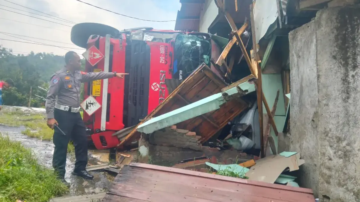 “Truck tangki kemudian terguling ke arah bahu jalan dan menabrak bagian depan bangunan rumah serta membentur kendaraan pick up bernomor polisi D-1391-VS yang sedang terparkir di dalam rumah,” jelasnya.